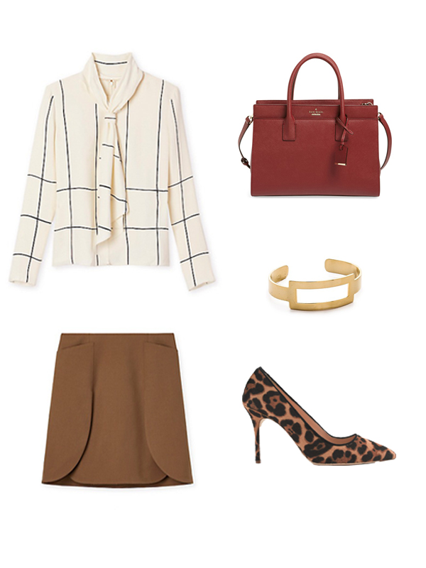 This outfit is not only great for the workplace, but each individual piece can be worn out at night or during the day, and works with anything is that already in your closet. I like the mix of patterns with the plaid silk shirt and leopard heels. This white bow top is a staple design that the two patterns do not clash—and we are all in an agreement that leopard is a neutral right? A woman should always have at least one pair of leopard heels in her closet. Leopard, when done right, can be an elegant, stylish touch to any outfit. This silk bow top is professional and stylish. I could easily pair it with jeans for a day of shopping or pair it with leather pants for an evening out.