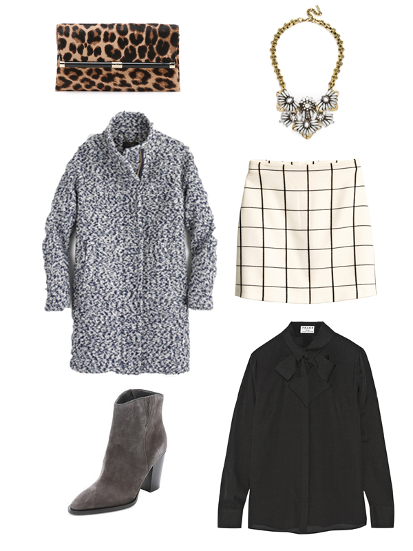 handbag // necklace // skirt // coat // booties // blouse