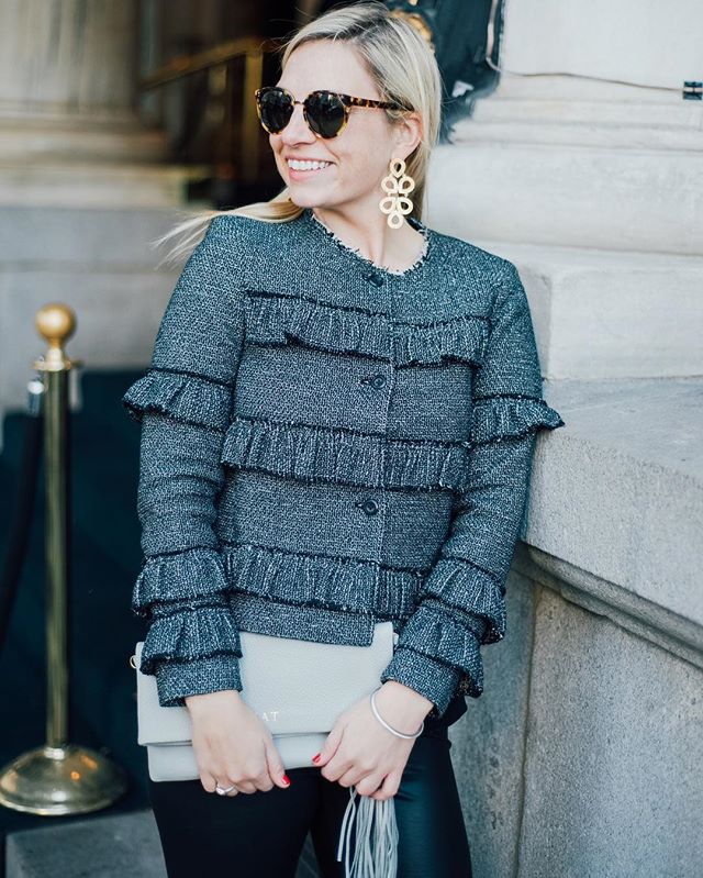 Getting a little festive with this chic tweed jacket. I love the ruffle details and the shiny fabric making any outfit feel more elevated.