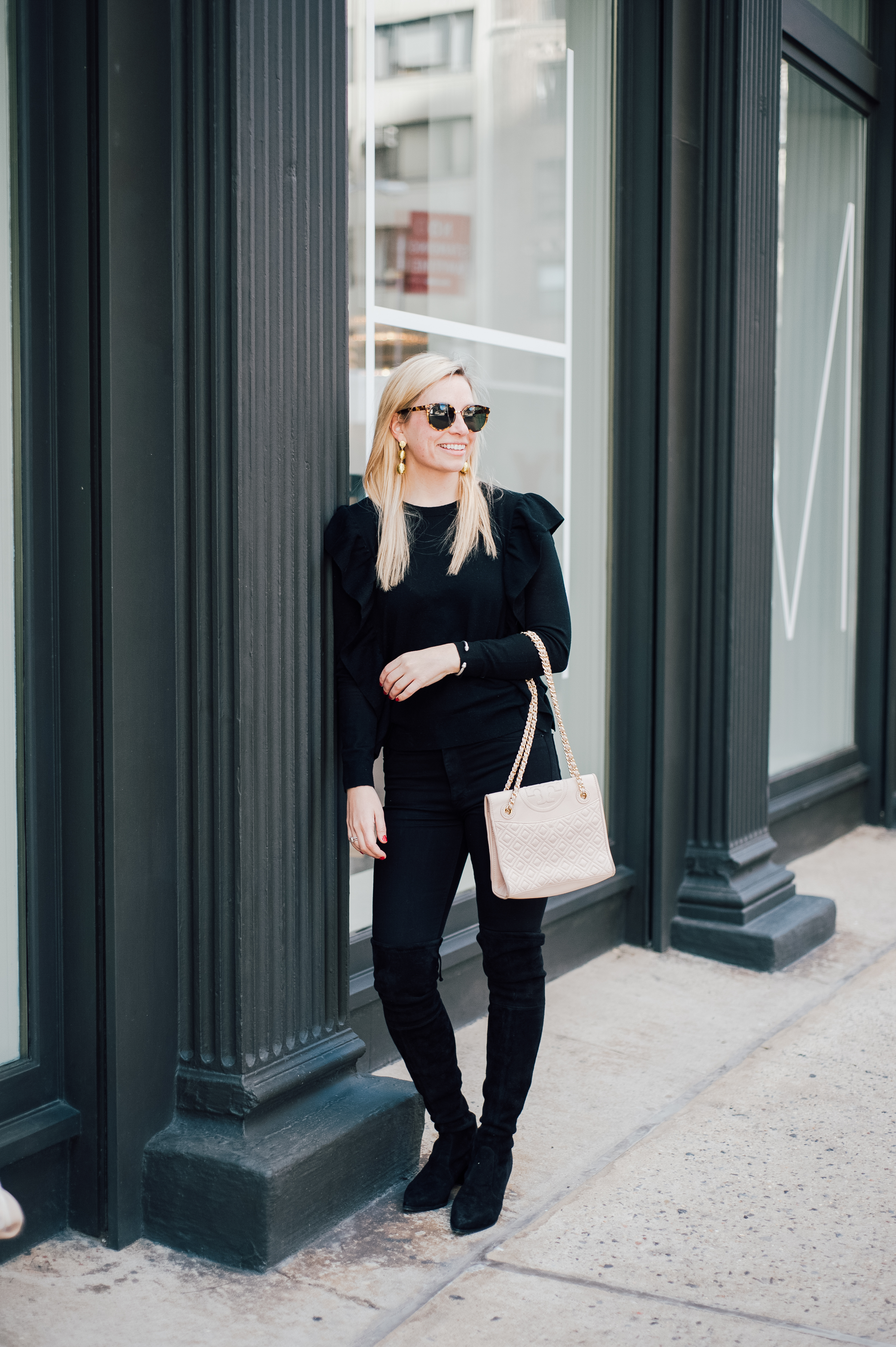 ruffle sweater (on sale!!) // over the knee boots // high-waisted jeans