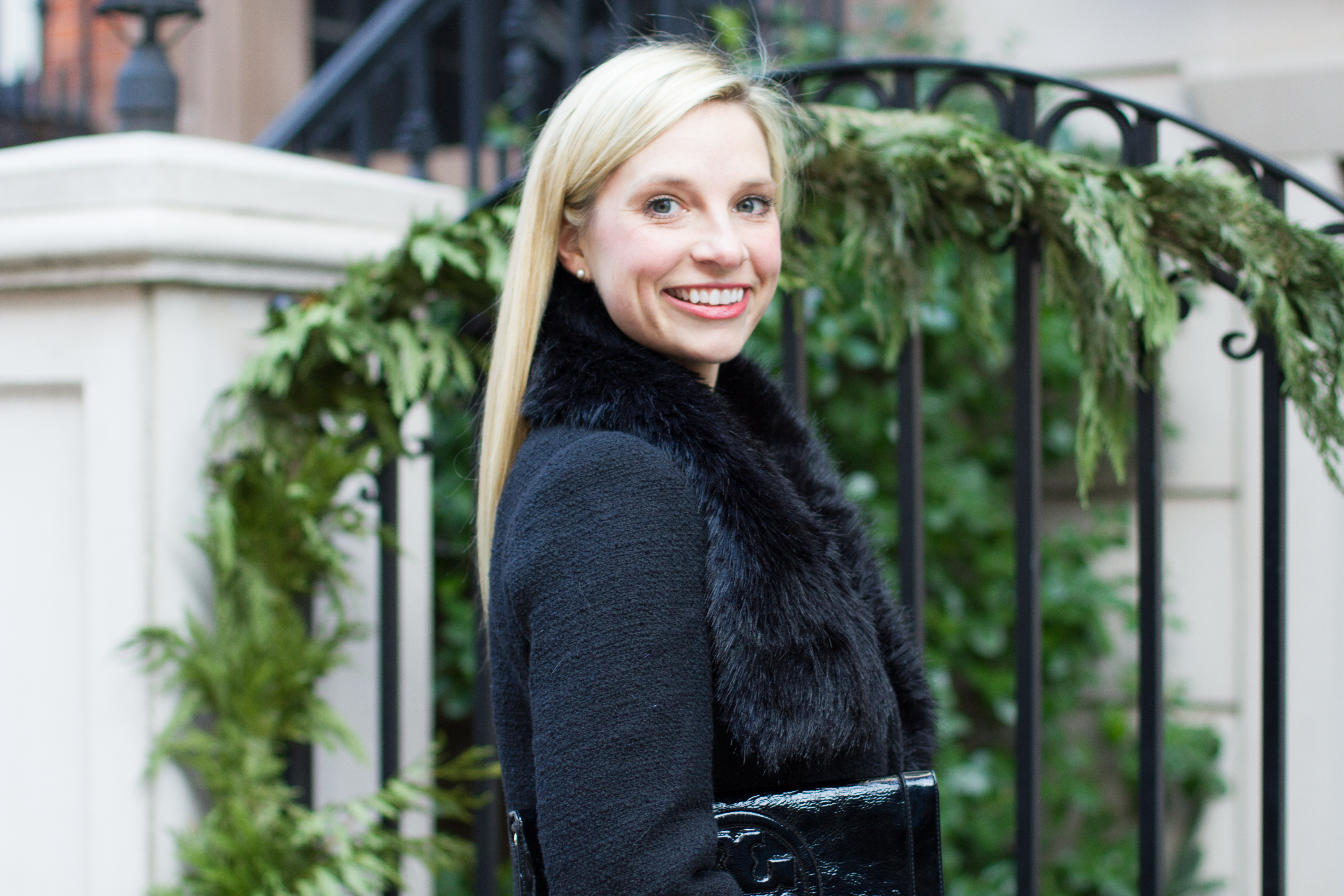 fur scarf (similar) // tweed jacket (on sale!) // clutch (similar)