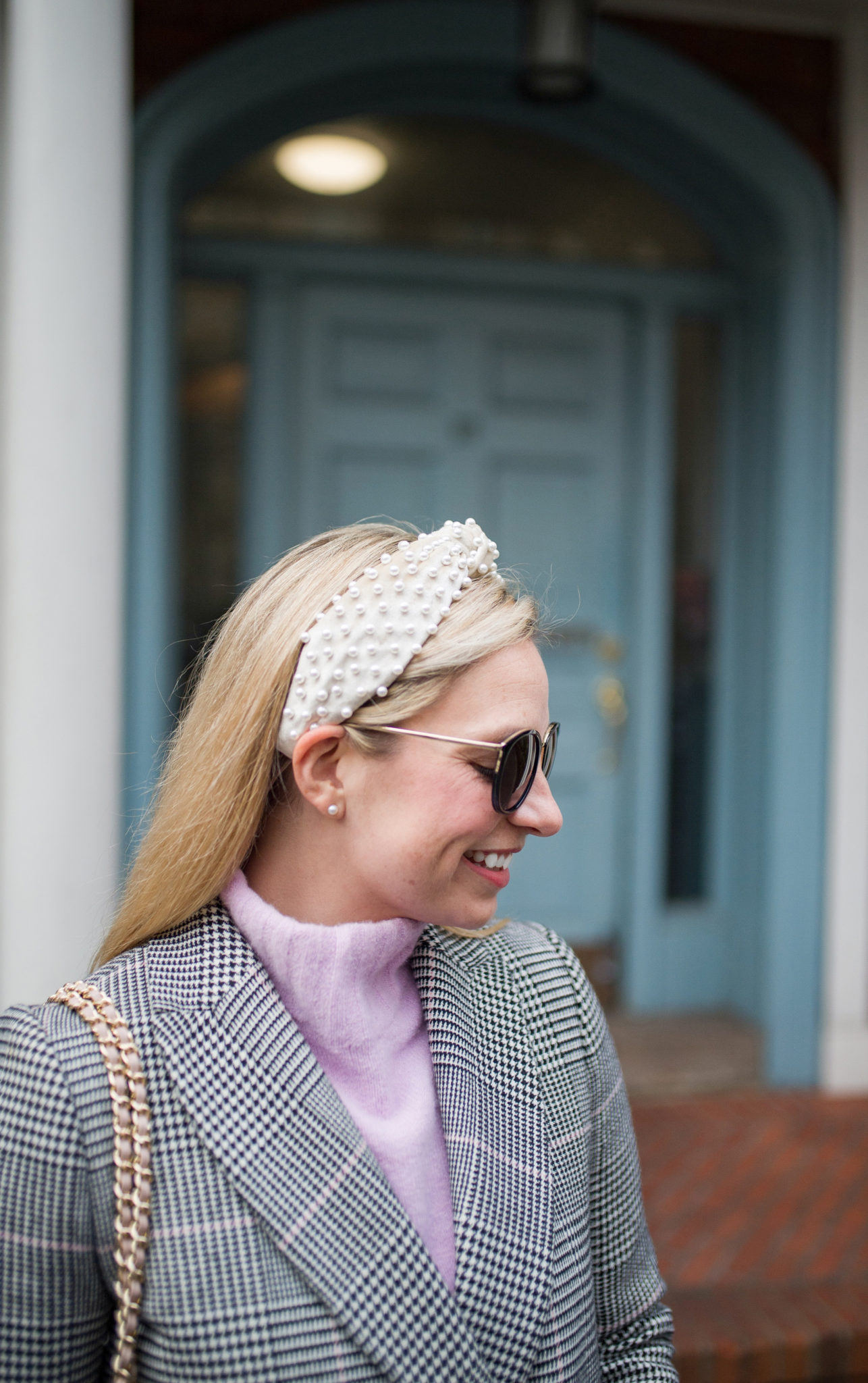 plaid coat // pink booties // jeans // pearl headband // shoulder bag // sweater