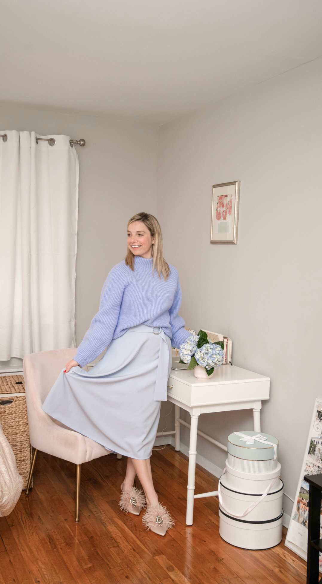 sweater // skirt // Tory Burch feathered shoes (similar) // desk // desk chair